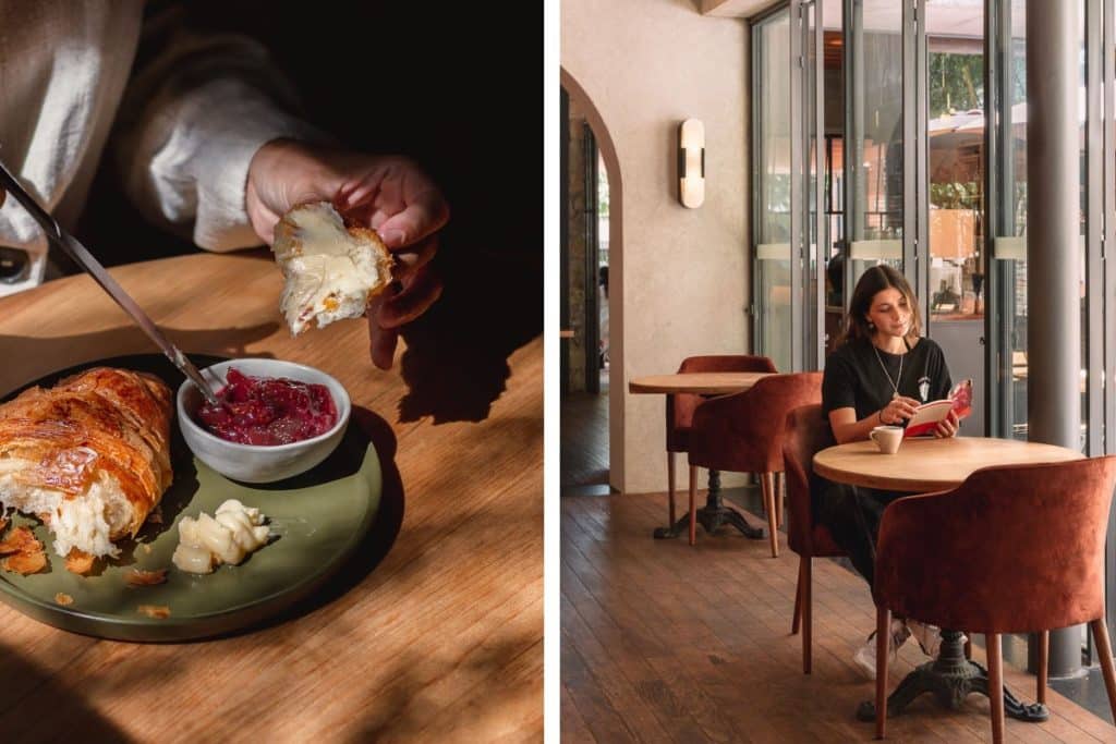 Si bien dentro de su carta encontrarás una buena variedad de platillos de inspiración franco-mexicana (pan francés, tartas, benedictinos), una de nuestras partes favoritas, y que los distingue de resto, es su barra de postres. Encontrarás un surtido de pasteles y panes inspirados en la temporada.